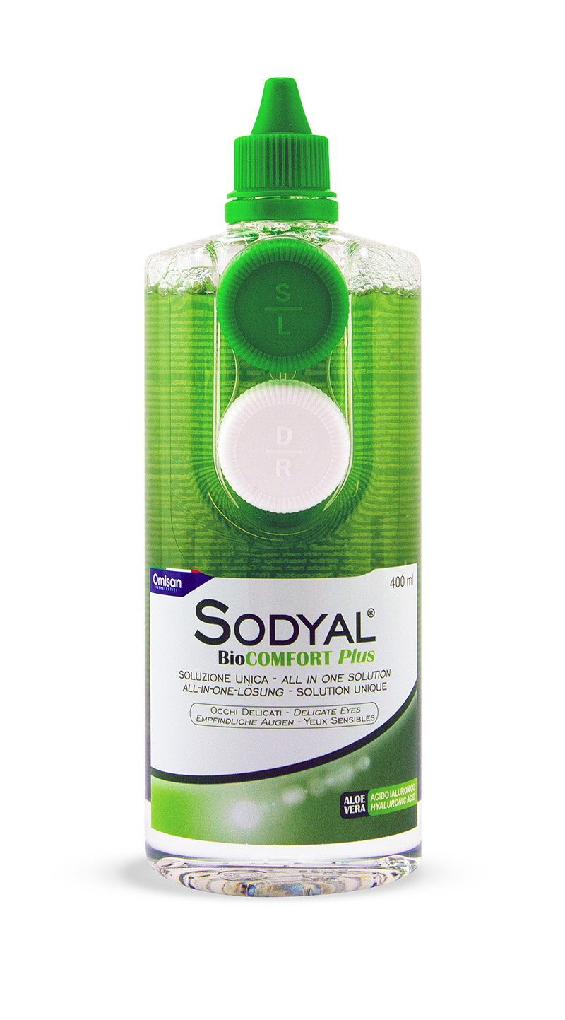 Die Kombilösung enthält gleich drei benetzende Inhaltsstoffe: Hyaluron, HPMC und PVP. Das in der Lösung enthaltene Aloe vera untertsützt die Epithelregeneration für langes komfortables Kontaktlinsentragen. Zusätzlich sind Desinfektions- und Konservierungsstoffe nur in geringer Konzentration enthalten. Die Lösung verbindet damit hohen Komfort mit besonders guter Verträglichkeit. SODYAL® BioComfort Plus ist durch den Inhaltsstoff Pluronic auch in der Lage, während der Pflege Proteine von der Kontaktlinse zu lösen. Das transparente Flaschendesign der Lösung ist patentiert. Es ermöglicht die Kontrolle des Füllstandes und macht außerdem eine Verpackungsbox überflüssig.
